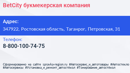 BetCity, букмекерская компания по адресу 347922, Ростовская область, Таганрог, Петровская, 31 в дальнейшем Организация, размещена в следующих категориях: