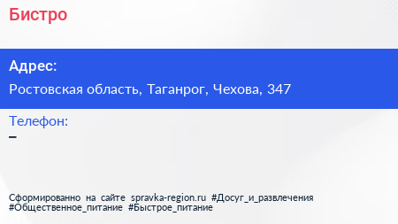 Бистро по адресу Ростовская область, Таганрог, Чехова, 347 в дальнейшем Организация, размещена в следующих категориях: