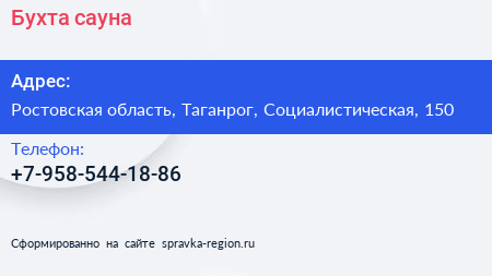 Бухта, сауна по адресу Ростовская область, Таганрог, Социалистическая, 150 в дальнейшем Организация, размещена в следующих категориях: