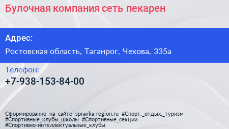 Булочная компания, сеть пекарен по адресу Ростовская область, Таганрог, Чехова, 335а в дальнейшем Организация, размещена в следующих категориях: