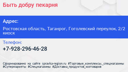 Быть добру, пекарня по адресу Ростовская область, Таганрог, Гоголевский переулок, 2/2 киоск в дальнейшем Организация, размещена в следующих категориях:
