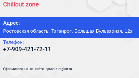 Chillout zone по адресу Ростовская область, Таганрог, Большая Бульварная, 12а в дальнейшем Организация, размещена в следующих категориях: