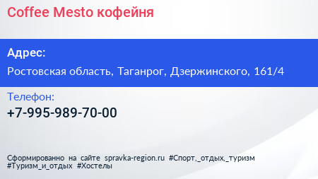 Coffee Mesto, кофейня по адресу Ростовская область, Таганрог, Дзержинского, 161/4 в дальнейшем Организация, размещена в следующих категориях: