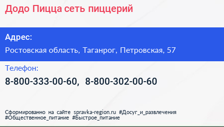 Додо Пицца, сеть пиццерий по адресу Ростовская область, Таганрог, Петровская, 57 в дальнейшем Организация, размещена в следующих категориях: