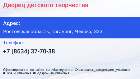 Дворец детского творчества по адресу Ростовская область, Таганрог, Чехова, 333 в дальнейшем Организация, размещена в следующих категориях: