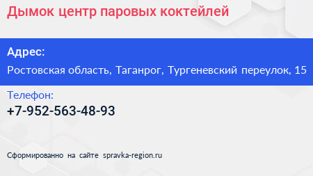 Дымок, центр паровых коктейлей по адресу Ростовская область, Таганрог, Тургеневский переулок, 15 в дальнейшем Организация, размещена в следующих категориях: