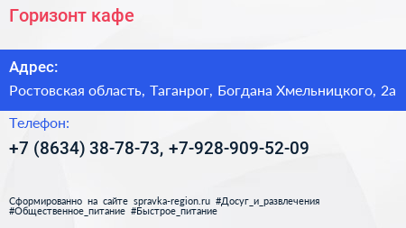 Горизонт, кафе по адресу Ростовская область, Таганрог, Богдана Хмельницкого, 2а в дальнейшем Организация, размещена в следующих категориях: