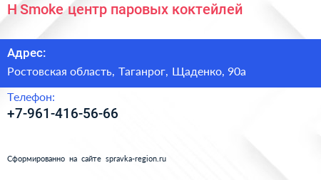 H.Smoke, центр паровых коктейлей по адресу Ростовская область, Таганрог, Щаденко, 90а в дальнейшем Организация, размещена в следующих категориях:
