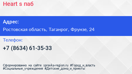 Heart`s, паб по адресу Ростовская область, Таганрог, Фрунзе, 24 в дальнейшем Организация, размещена в следующих категориях:
