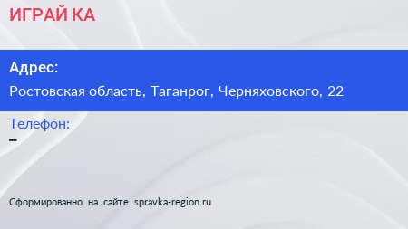 ИГРАЙ-КА по адресу Ростовская область, Таганрог, Черняховского, 22 в дальнейшем Организация, размещена в следующих категориях: