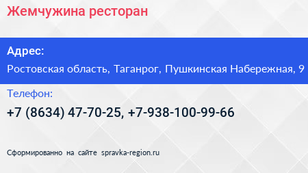 Жемчужина, ресторан по адресу Ростовская область, Таганрог, Пушкинская Набережная, 9 в дальнейшем Организация, размещена в следующих категориях: