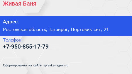 Живая Баня по адресу Ростовская область, Таганрог, Портовик снт, 21 в дальнейшем Организация, размещена в следующих категориях: