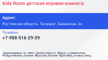 Kids Room, детская игровая комната по адресу Ростовская область, Таганрог, Бакинская, 2а в дальнейшем Организация, размещена в следующих категориях: