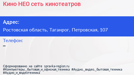 Кино НЕО, сеть кинотеатров по адресу Ростовская область, Таганрог, Петровская, 107 в дальнейшем Организация, размещена в следующих категориях: