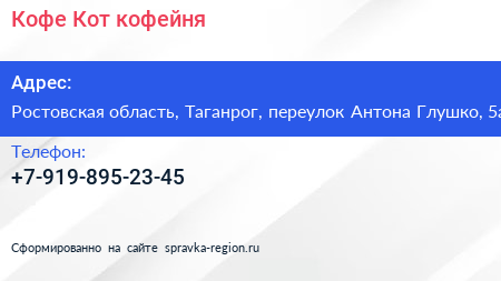 Кофе Кот, кофейня по адресу Ростовская область, Таганрог, переулок Антона Глушко, 5а в дальнейшем Организация, размещена в следующих категориях: