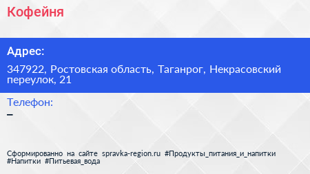 Кофейня по адресу 347922, Ростовская область, Таганрог, Некрасовский переулок, 21 в дальнейшем Организация, размещена в следующих категориях: