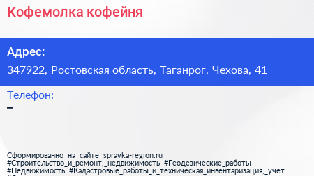 Кофемолка, кофейня по адресу 347922, Ростовская область, Таганрог, Чехова, 41 в дальнейшем Организация, размещена в следующих категориях: