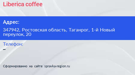 Liberica coffee по адресу 347942, Ростовская область, Таганрог, 1-й Новый переулок, 20 в дальнейшем Организация, размещена в следующих категориях: