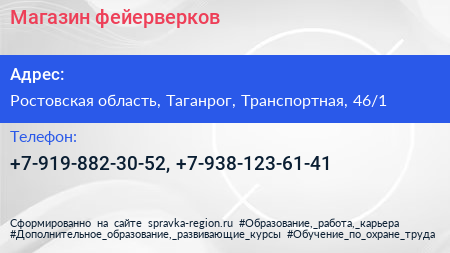 Магазин фейерверков по адресу Ростовская область, Таганрог, Транспортная, 46/1 в дальнейшем Организация, размещена в следующих категориях: