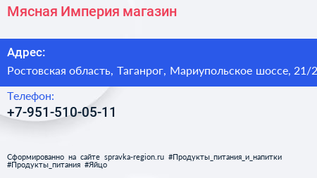 Мясная Империя, магазин по адресу Ростовская область, Таганрог, Мариупольское шоссе, 21/2 в дальнейшем Организация, размещена в следующих категориях: