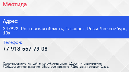 Меотида по адресу 347922, Ростовская область, Таганрог, Розы Люксембург, 13а в дальнейшем Организация, размещена в следующих категориях: