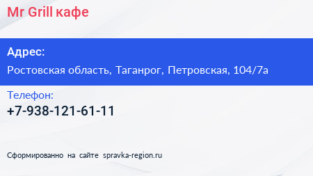 Mr.Grill, кафе по адресу Ростовская область, Таганрог, Петровская, 104/7а в дальнейшем Организация, размещена в следующих категориях: