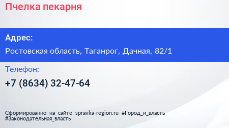 Пчелка, пекарня по адресу Ростовская область, Таганрог, Дачная, 82/1 в дальнейшем Организация, размещена в следующих категориях:
