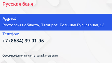 Русская баня по адресу Ростовская область, Таганрог, Большая Бульварная, 13 в дальнейшем Организация, размещена в следующих категориях: