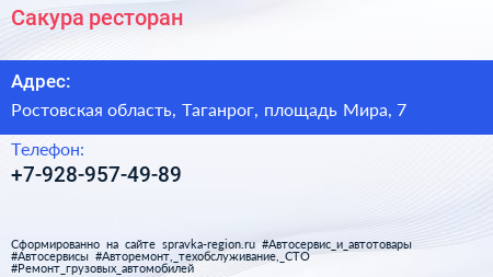 Сакура, ресторан по адресу Ростовская область, Таганрог, площадь Мира, 7 в дальнейшем Организация, размещена в следующих категориях: