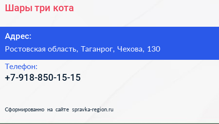 Шары три кота по адресу Ростовская область, Таганрог, Чехова, 130 в дальнейшем Организация, размещена в следующих категориях: