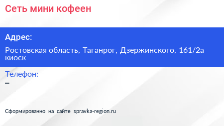 Сеть мини-кофеен по адресу Ростовская область, Таганрог, Дзержинского, 161/2а киоск в дальнейшем Организация, размещена в следующих категориях: