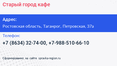 Старый город, кафе по адресу Ростовская область, Таганрог, Петровская, 37а в дальнейшем Организация, размещена в следующих категориях: