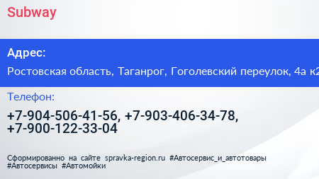 Subway по адресу Ростовская область, Таганрог, Гоголевский переулок, 4а к2 в дальнейшем Организация, размещена в следующих категориях:
