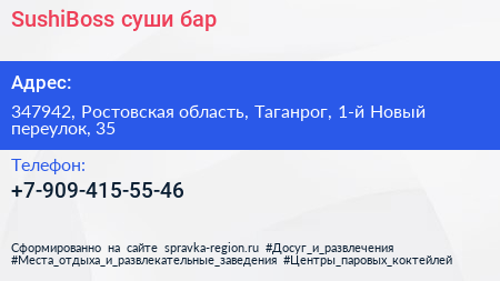 SushiBoss, суши-бар по адресу 347942, Ростовская область, Таганрог, 1-й Новый переулок, 35 в дальнейшем Организация, размещена в следующих категориях: