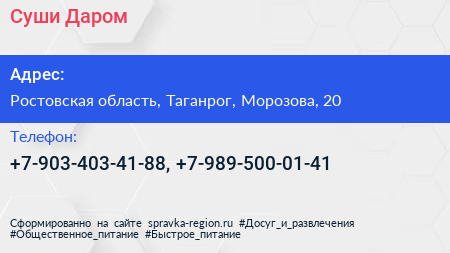 Суши Даром по адресу Ростовская область, Таганрог, Морозова, 20 в дальнейшем Организация, размещена в следующих категориях:
