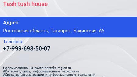 Tash-tush-house по адресу Ростовская область, Таганрог, Бакинская, 65 в дальнейшем Организация, размещена в следующих категориях: