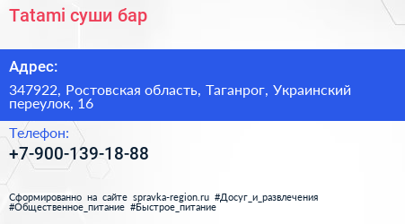 Tatami, суши-бар по адресу 347922, Ростовская область, Таганрог, Украинский переулок, 16 в дальнейшем Организация, размещена в следующих категориях: