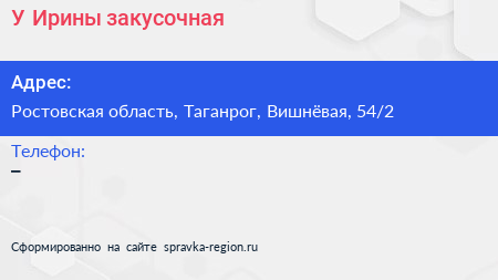 У Ирины, закусочная по адресу Ростовская область, Таганрог, Вишнёвая, 54/2 в дальнейшем Организация, размещена в следующих категориях: