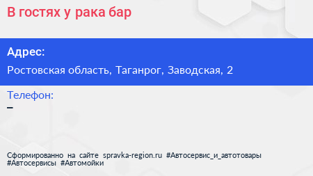 В гостях у рака, бар по адресу Ростовская область, Таганрог, Заводская, 2 в дальнейшем Организация, размещена в следующих категориях: