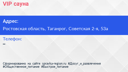 VIP, сауна по адресу Ростовская область, Таганрог, Советская 2-я, 53а в дальнейшем Организация, размещена в следующих категориях: