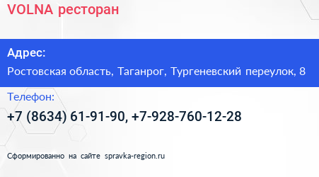 VOLNA, ресторан по адресу Ростовская область, Таганрог, Тургеневский переулок, 8 в дальнейшем Организация, размещена в следующих категориях: