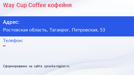 Way Cup Coffee, кофейня по адресу Ростовская область, Таганрог, Петровская, 53 в дальнейшем Организация, размещена в следующих категориях: