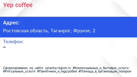 Yep coffee по адресу Ростовская область, Таганрог, Фрунзе, 2 в дальнейшем Организация, размещена в следующих категориях: