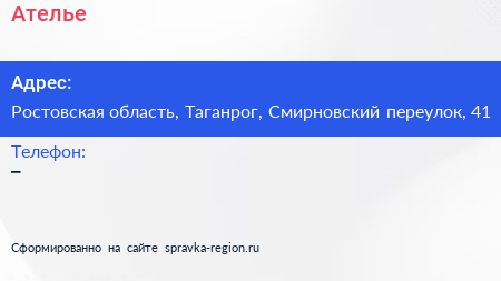Ателье по адресу Ростовская область, Таганрог, Смирновский переулок, 41 в дальнейшем Организация, размещена в следующих категориях: