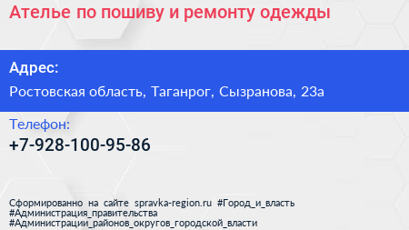 Ателье по пошиву и ремонту одежды по адресу Ростовская область, Таганрог, Сызранова, 23а в дальнейшем Организация, размещена в следующих категориях: