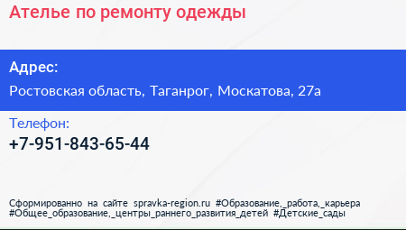 Ателье по ремонту одежды по адресу Ростовская область, Таганрог, Москатова, 27а в дальнейшем Организация, размещена в следующих категориях:
