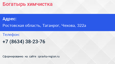 Богатырь, химчистка по адресу Ростовская область, Таганрог, Чехова, 322а в дальнейшем Организация, размещена в следующих категориях: