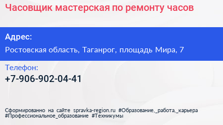 Часовщик, мастерская по ремонту часов по адресу Ростовская область, Таганрог, площадь Мира, 7 в дальнейшем Организация, размещена в следующих категориях:
