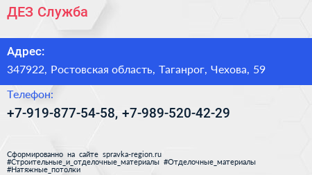 ДЕЗ Служба по адресу 347922, Ростовская область, Таганрог, Чехова, 59 в дальнейшем Организация, размещена в следующих категориях: