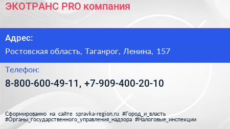 ЭКОТРАНС PRO, компания по адресу Ростовская область, Таганрог, Ленина, 157 в дальнейшем Организация, размещена в следующих категориях:
